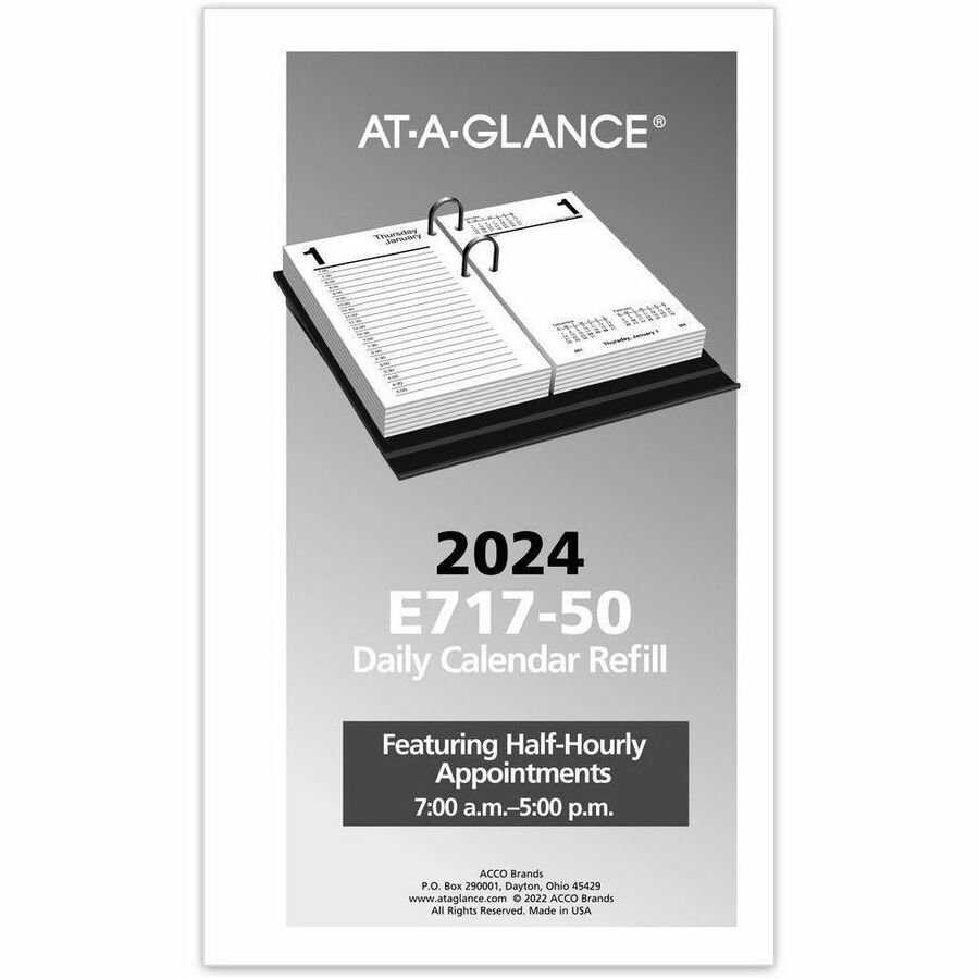 Keep up-to-date and organized with this daily desk calendar refill. Dated planning pages range 12 months from January to December and feature count of days/days remaining. Loose-leaf desk calendar refill features each weekday on a two-page spread with ruled, half-hourly appointment times from 7 AM to 5 PM as well as past, current and future months reference and count of days/days remaining. Bases and refills are sold separately. Refill is sized and two-hole punched to fit standard 17-style bases with two rings (E17, M17 and J17).