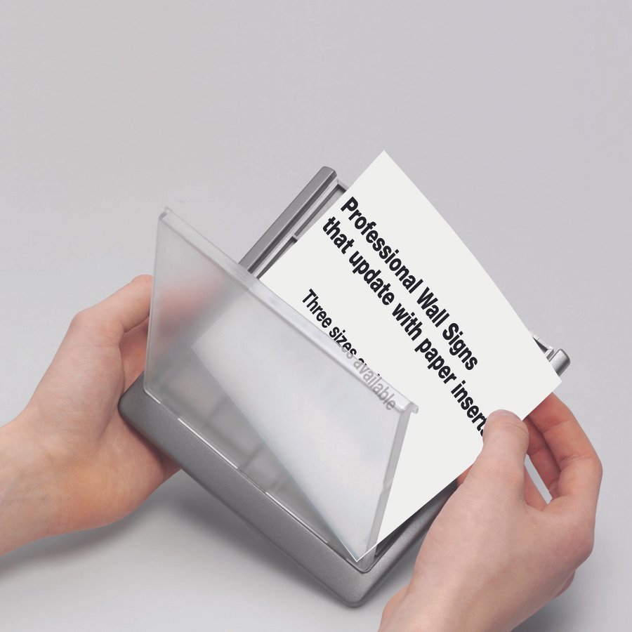 Sign holders offer easy-to-keep-current signage made simple. Easy-open, transparent acrylic windows let you update messages in seconds. Provide the ideal solution to identify room function, employee name and title, tenant name and more. Free insert design software is available online. Sign holders come with screws and anchors for wall or door mounting and adhesive pads for mounting to other surfaces. Attach sign holders to fabric panel walls with metal two-prong panel pin accessories, sold separately in a box of 10. Packs of sign inserts are also sold separately.