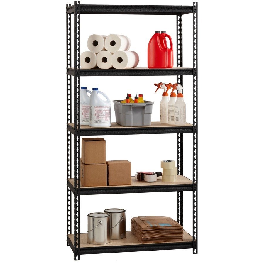 Iron Horse Riveted Steel Shelving offers a boltless design for simple assembly. It holds up to 2,300 lb. of evenly distributed weight on its particleboard shelving. The five shelves are supported by a black steel frame with a powder-coat finish for durability. Shelving assembles vertically or horizontally.