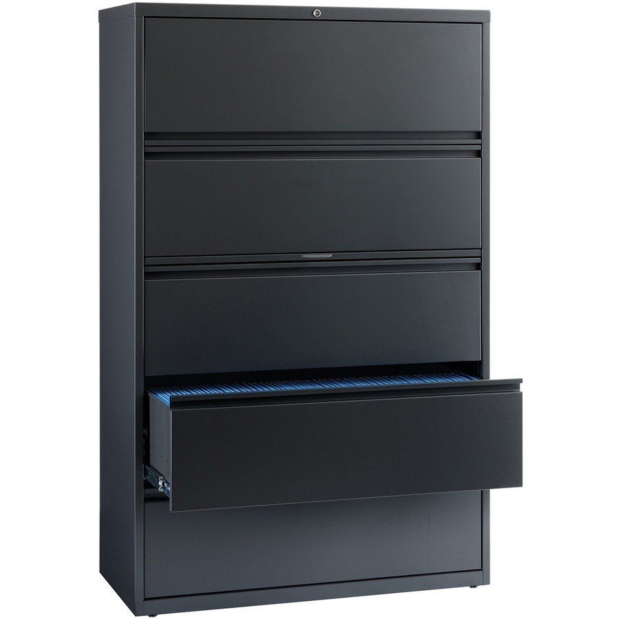 Marketing Information:42″ wide lateral file features a roll-out binder storage/posting shelf and four drawers with hanging file rails for side-to-side filing of letter-size, legal-size or A4-size folders for versatility. Each drawer has a magnetic label holder for easy identification where you need it. Design also features a core-removable lock for security, dual locking bars, full-width pull, ball-bearing slide suspension for smooth opening and closing, reinforced base, and four adjustable leveling guides for stabilization. Interlock system prohibits the extension of more than one drawer at a time for your safety. Counterweight prevents tipping. Lateral file meets or exceeds applicable ANSI/BIFMA standards.